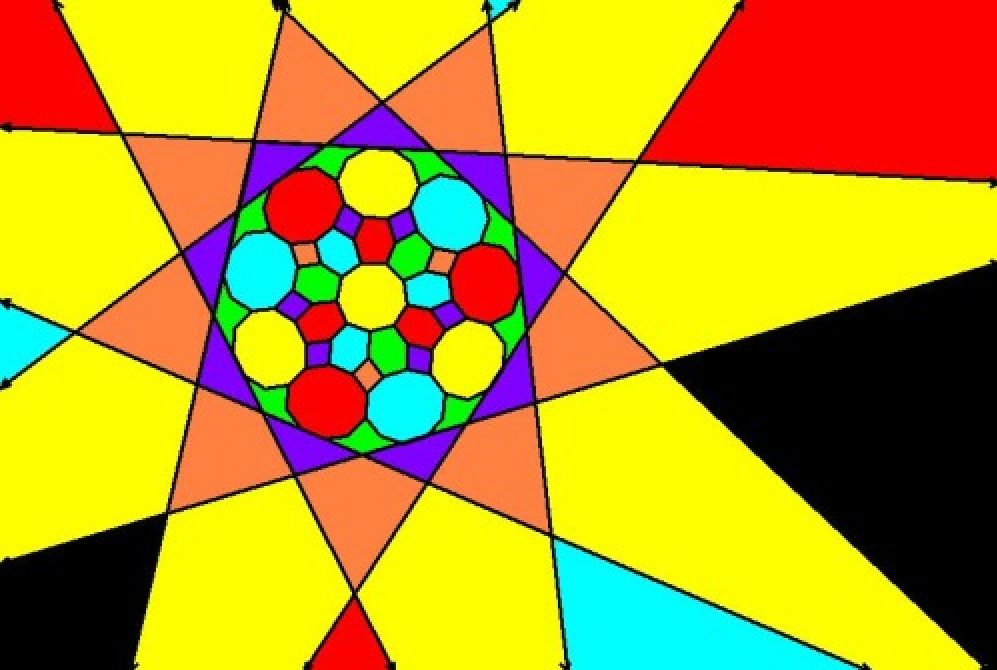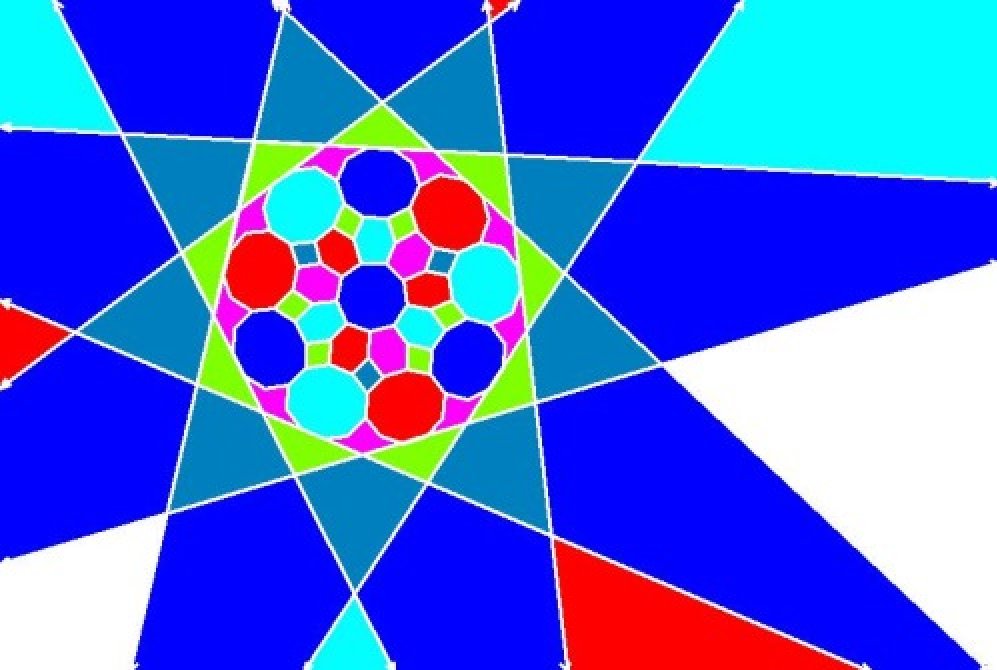 The red figure above is a regular enneagon, or nine-sided polygon, and it has three regular enneagrams (or “star enneagons”) inside it. The light blue figure is called a {9,2} enneagram. The green figure can be viewed two ways: as a {9,3} enneagram, or as a compound of three equilateral triangles. Finally, the yellow figure is a {9,4} enneagram.