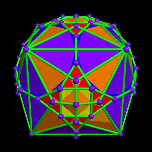Stella 4d has a “try to make faces regular” function, and I next used it on the polyhedron immediately above. If this function cannot work, though — because making the faces regular is mathematically impossible — one sometimes gets completely unexpected, and interesting, results. Such was the case here.