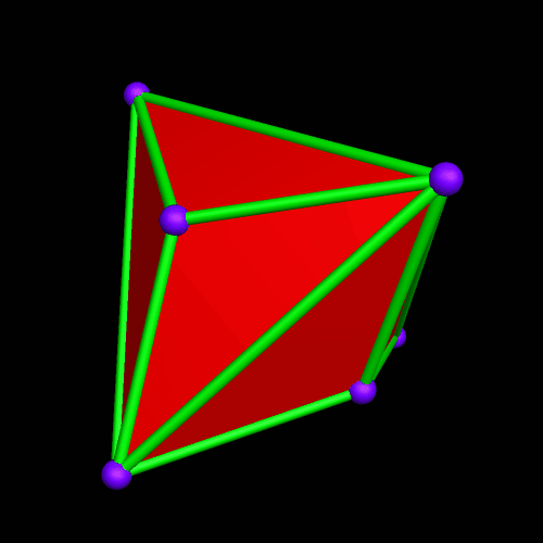 The components of this compound looked like triakis tetrahedra to me. The triakis tetrahedron, shown below, is the dual of the truncated tetrahedron. However, I checked the angle measurement of a face, and the components of the above compound-dual are only close, but not quite, to being the same as the true triakis tetrahedron, which is shown below.