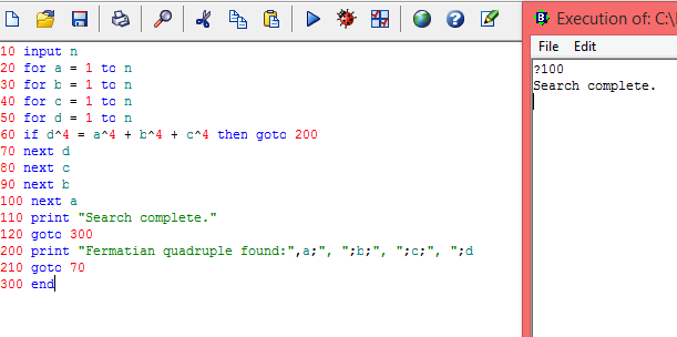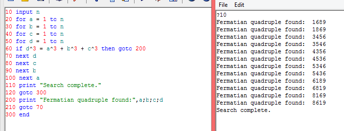 Once the workday was over, I contemplated looking over lists of perfect cubes (since three as the exponent is the logical place to start looking), seeking three of them that would sum to a fourth, and quickly decided that was not the approach I wanted to use . . . because it sounded ridiculously tedious. Mathematics is supposed to be fun, after all, not an exercise in boredom. I therefore resolved to use a different approach, and wrote a short program, in BASIC, to check all sets of four numbers between one, and any number I chose, to seek exponent-three Fermatian quadruples. For the first trial run of this program, I considered checking all numbers between 1 and 100, but, since the program involves quadruple-nested loops, I decided I did not want to wait for my computer to check 100^4 = 100 million different combinations, so I made my first check with much more modest search parameters: only the numbers from one to ten. To my surprise, this search actually revealed two Fermatian quadruples.
