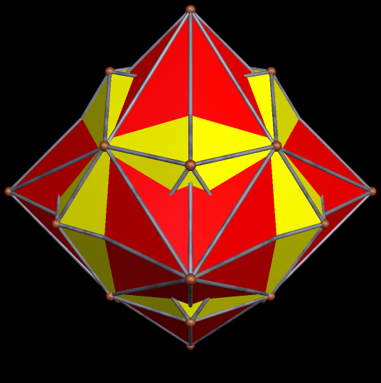 The next image shows what the icosahedron looks like after a single stellation, when performed through the “lens” of tetrahedral symmetry. This stellation extends the red triangles as kites, and hides the yellow triangles from view in the process.