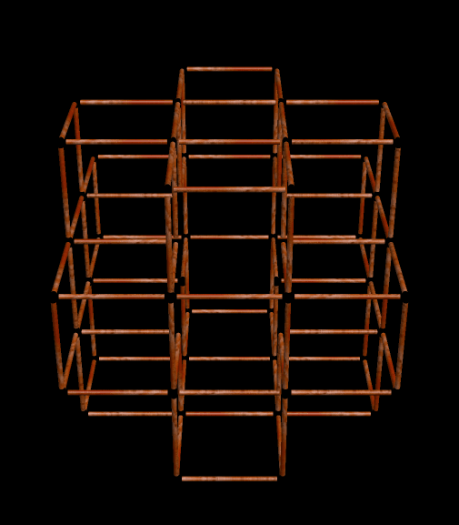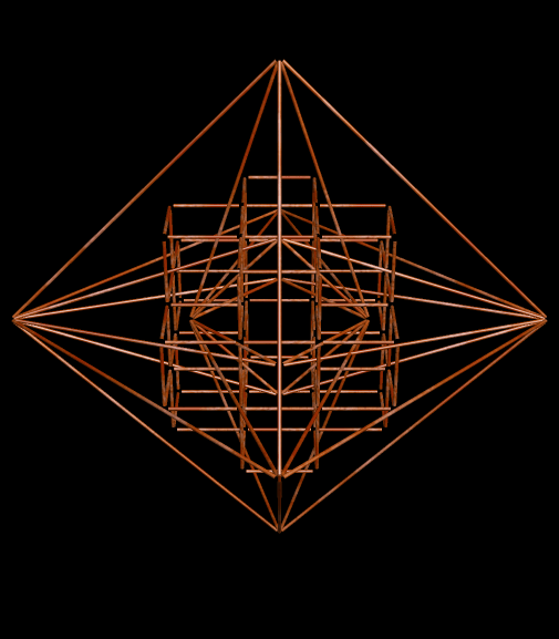 Obviously, I am trying to find a way to express the number of cells in the nth figure, in terms of n, but with only limited success, so far. The first six terms are 1, 7, 25, 63, 129, 231, and patterns of numbers above could easily be used to predict the seventh term, but that’s not my goal. What I want is a simple formula which will give me the total number of cells, in terms of n, for the nth of these octahedral lattices of rhombic triacontahedra. I’ll go ahead and find the seventh term, though, in the hope that it will help me figure out the pattern. When n = 7, the total number of cells will equal 13(1) + 11(4) + 9(8) + 7(12) + 5(16) + 3(20) + 1(24) = 13 + 44 + 72 + 84 + 80 + 60 + 24 = 377. Having found that number, I might as well throw in another picture, also. Stella 4d: Polyhedron Navigator, makes these rotating images easy to make, and you can try that program’s trial version for free, or purchase the fully-functioning version I use, at http://www.software3d.com/Stella.php.