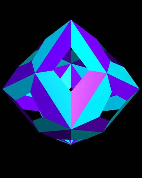 This is an octahedron which has had short pyramids excavated from each of its faces. If the pyramids are made taller, their vertices coincide at the octahedron’s center. At that point, unlike in the figure above, the polyhedron’s volume reaches zero — turning it into a special type of polyhedron called a nulloid: