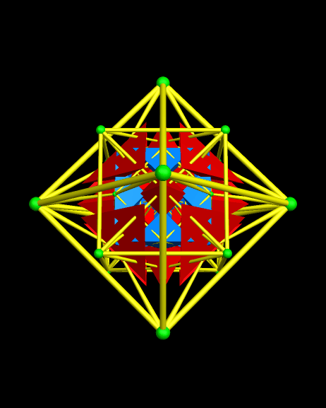 The five Platonic solids have analogs among these six convex polychora, and then there’s one left over — the oddball among the regular, convex polychora. It’s the figure you see above, rotating in hyperspace: the 24-cell, also known as the icositetrachoron. Its twenty-four cells are octahedra.