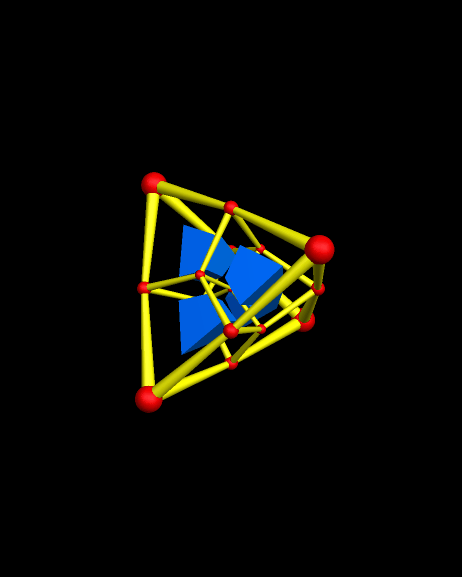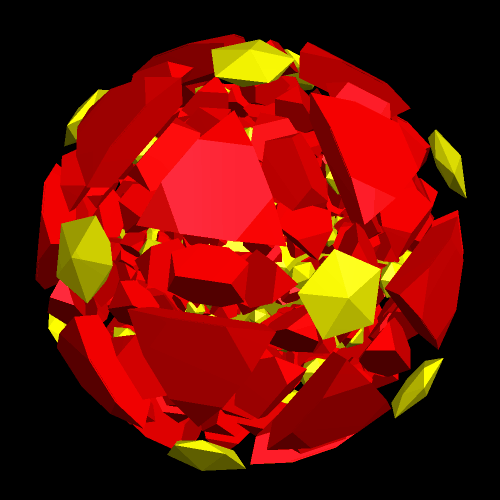 One of the regular 4-dimensional polytopes, or polychora, is called the 600-cell. If you truncate it, you get the figure above, called “23-tex” for short. Its unit cells are 600 truncated tetrahedra, as well as 120 icosahedra. As shown above, you see only the cells, with space between them so you can see them, and vertices and edges rendered invisible. If the vertices and edges are shown, though, 23-tex looks like this: