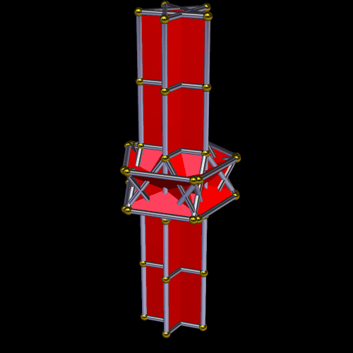 This is a projection of a rotating duoprism, a four-dimensional figure, with bases which are all star pentagons. This polytope’s faces include ten of these pentagrams, and twenty-five squares. Its three-dimensional cells are ten pentagrammic prisms. I made it using Stella 4d, a program which you can try, for free, at http://www.software3d.com/Stella.php. Here is this duoprism’s three-dimensional net.