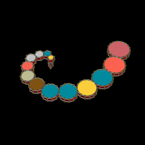 The red figure above is a regular enneagon, or nine-sided polygon, and it has three regular enneagrams (or “star enneagons”) inside it. The light blue figure is called a {9,2} enneagram. The green figure can be viewed two ways: as a {9,3} enneagram, or as a compound of three equilateral triangles. Finally, the yellow figure is a {9,4} enneagram.