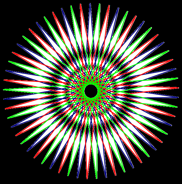I turn 57 years old today, so here is a 57-pointed star to mark the occasion. It’s actually 3 stars, each of which has 19 points, which works because (3)(19) = 57. The individual stars here are {19/9} enneadecagrams — a blue one on the bottom layer, with green on the top, and red for the in-between star.