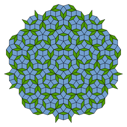 In these two rhombi, the golden ratio shows up as the side-to-short-diagonal ratio (in the case of the 36-144-36-144 rhombus), and the long-diagonal-to-side ratio (in the case of the 72-108-72-108 rhombus). These two rhombi have a special property: together, they can tile a plane in a pattern which never repeats itself, but, despite this, can be continued indefinitely. This “aperiodic tiling” was discovered by Roger Penrose, a physicist and mathematician. The image below, showing part of such an aperiodic tiling, was found at https://en.wikipedia.org/wiki/Penrose_tiling.