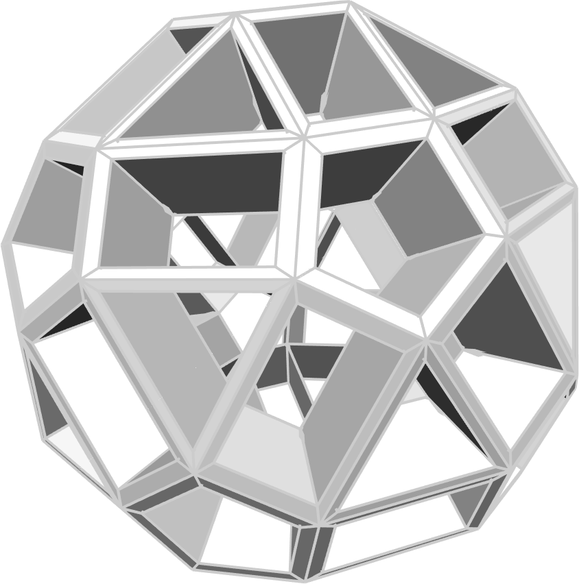 In this polyhedron, the twelve rhombic faces are in the same position as the faces of a rhombic dodecahedron — but narrowed, so as to make room for the kites. As for the kites, there are 24 of them — in eight sets of three. These set-of-threes’ positions correspond to those of the faces of an octahedron.