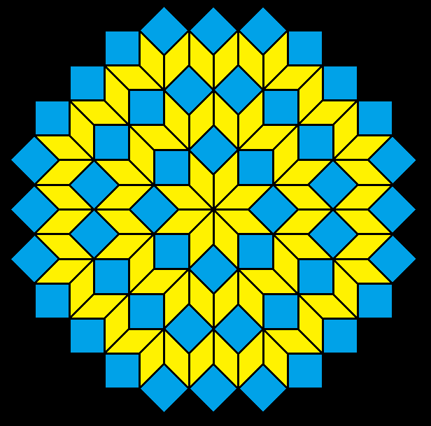 It’s hard to get regular pentagons, regular star pentagons, regular decagons, and related polygons to tessellate the plane while maintaining radial symmetry. This is my latest attempt.