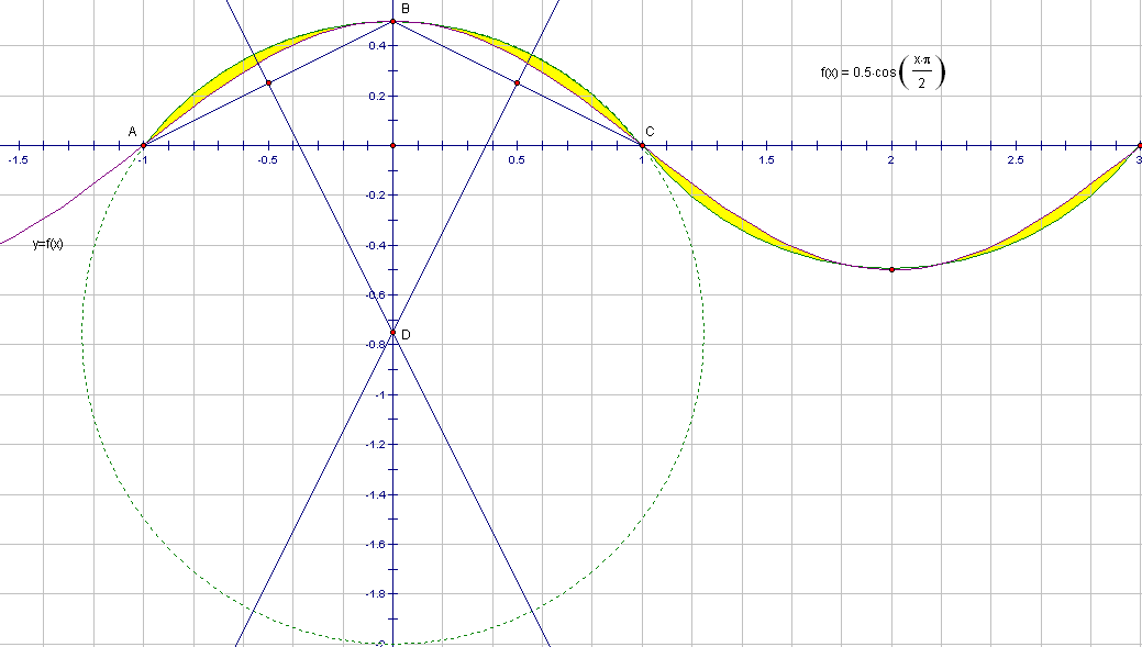 For every half-wavelength which starts at the rest position, an arc through three points is needed for the outer bound of the circumsinusoidal regions, which are shown in yellow. Those three points are two consecutive points (such as A and C above) where the sinusoidal wave crosses the rest position, plus the point at the top of the wave crest (such as B), or the point at the bottom of the trough, exactly half-way along the sinusoidal curve, in-between the two consecutive rest-position points under examination. In this example using points A, B, and C, above, the circle containing those points was constructed by drawing segments AB and BC, and then constructing the perpendicular bisectors of those two segments. Thone perpendicular disectors intersect at some point D, which is the center of a circle containing A, B, and C. The part of this circle which is not used for the arc through A, B, and C is shown as a dashed arc, while the arc used is shown as a solid curve. For other half-waves, to the left or right of this circle and arc, the construction would proceed in the same fashion, but is not shown, for the sake of clarity.