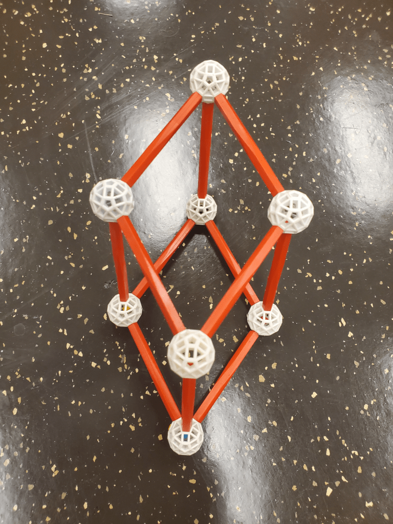 For the next polyehdron on this journey, I formed the dual of this convex hull. This solid is a symmetrohedron, featuring four regular hexagons, four equillateral triangles, and twelve isosceles triangles.
