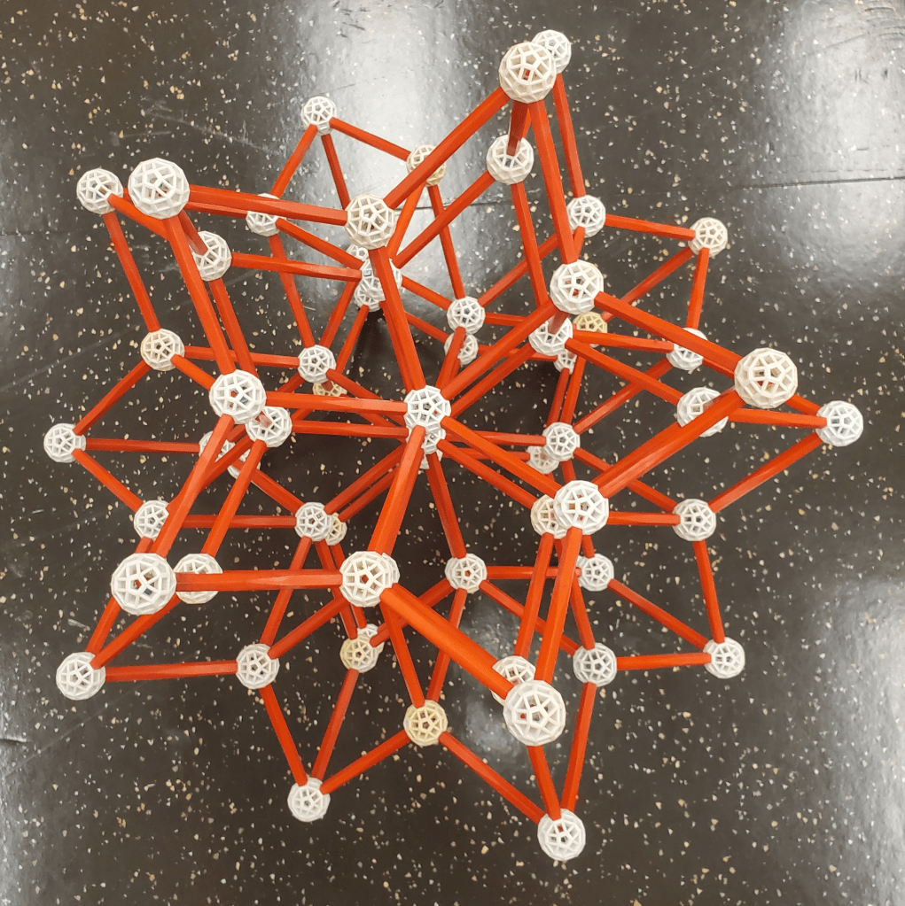 I decided to “take a walk” with this polyhedron. First, I used Stella 4d (available here) to make the compound of this solid and its dual, the Catalan solid named the triakis tetrahedron.