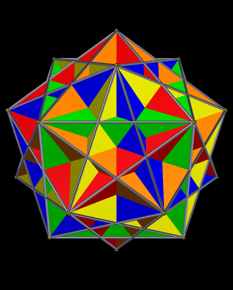 In this ten-part compound, the coloring-problem caused in the first image in this post, coplanar and overlapping triangles of different colors, vanishes, for those regions of overlap are hidden in the ten-part compound’s interior. This is one reason why this coloring-scheme is the one I find the most helpful, for this ten-part compound (unlike the two five-part compounds above). However, so that readers may make this choice for themselves, two other versions are shown below, starting with coloring by face type.