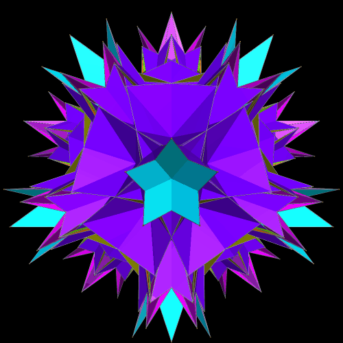 The dual to this cluster-polyhedron appears below. Both virtual models were created using Stella 4d: Polyhedron Navigator, software available here.