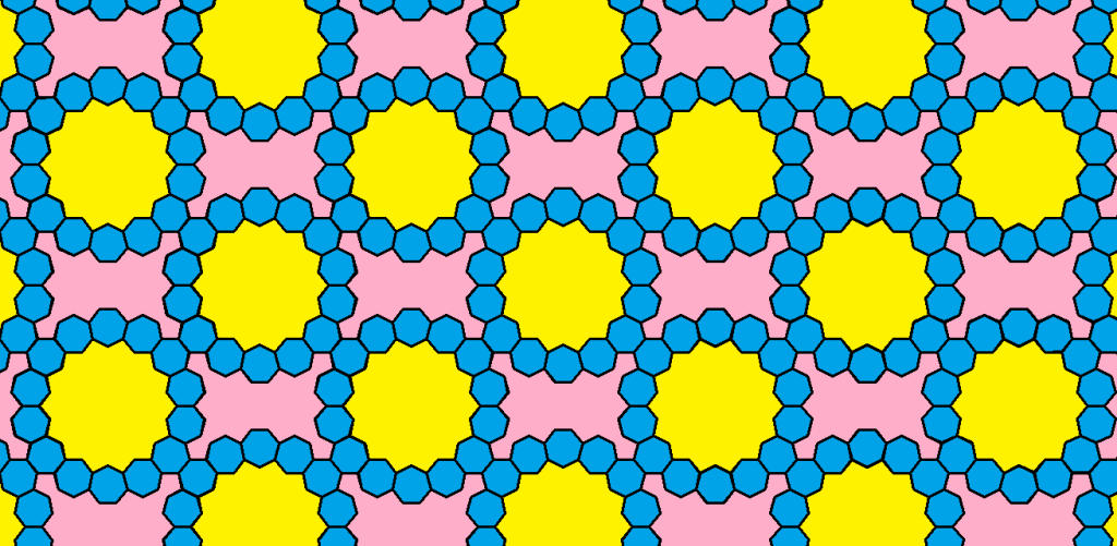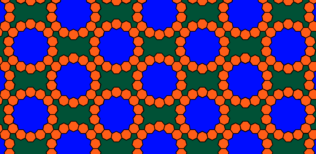 In addition to the central dodecagon, this mandala has two rings of squares, one of equilateral triangles, a ring of rhombi, another of regular hexagons, and, finally, a ring of equilateral decagons.