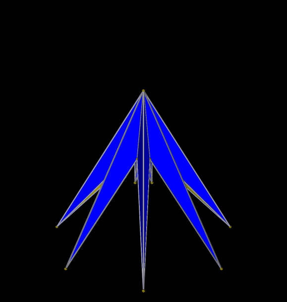 After making one of these, I then rotated it 1/49th of a full rotation, repeatedly, until I had seven of them inscribed in the circle. Seven times seven, of course, is 49, so this created one type (many are possible) of 49-pointed star. Also, I had already extended the line segments to form lines, so that this geometrical design would extend outside the circle. Next came thickening and blackening these lines, as well as the circle, and re-coloring the red points to be black, as well.