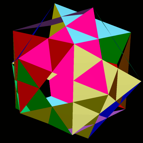 At least for me, the reason I had trouble understanding this figure, for so long, was that I mistook the small triangular “facelets” (the visible parts of the faces) for the triangular faces, themselves. In reality, the edges of the triangles are just as long as the star polygon edges. Because it has exactly two face-types which alternate around a vertex, it is edge-transitive (not all uniform polyhedra are), and so this polyhedron is part of smaller subset of uniform polyhedron called the quasiregular polyhedra.