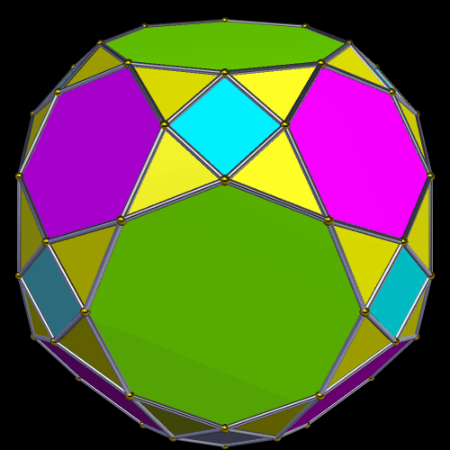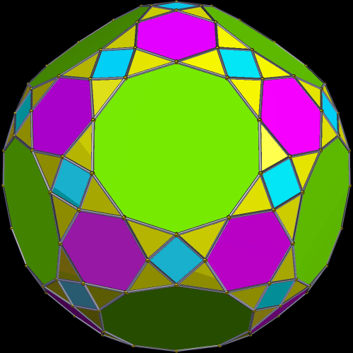 The second polyhedron shown, below, also has 42 regular decagons as faces, along with twenty equiangular hexagons, sixty isosceles triangles, sixty almost-square isosceles trapezoids, and 120 of another kind of isosceles trapezoid. That’s a total of 302 faces.