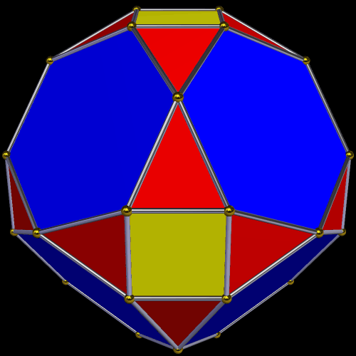 The first polyhedron shown here is also a symmetrohedron. 42 of its faces are regular decagons, and twenty are equilateral triangles. There are also sixty each of two types of isosceles trapezoids. That’s 182 faces in all.