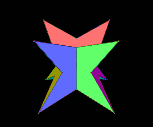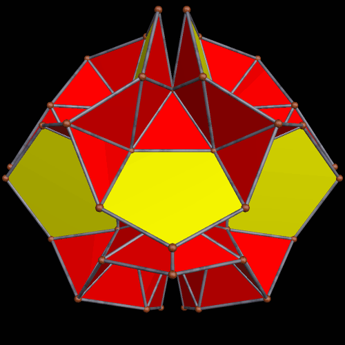 Using typical stellation (as opposed to this new variety), stellating the snub dodecahedron once turns all of the yellow triangles in the figure above into kites, covering each of the red triangles in the process. With “tetrahedral stellation,” though, this can be done in stages, producing a greater variety of snub-dodecahedron variants which feature kites. As it turns out, the kites appear twelve at a time, in four sets of three, with positions corresponding to the vertices (or the faces) of a tetrahedron. Here’s the first one, featuring one dozen kites.