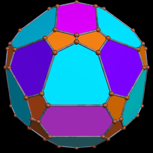 While the polyhedron above, informally known as the “soccer ball,” has icosidodecahedral symmetry, its coloring-scheme does not. Instead, I colored the faces in such a way that the coloring-scheme has pyritohedral symmetry — the symmetry of a standard volleyball. This rotating image was made with Stella 4d, a program you can buy, or try for free, right here: http://www.software3d.com/Stella.php.