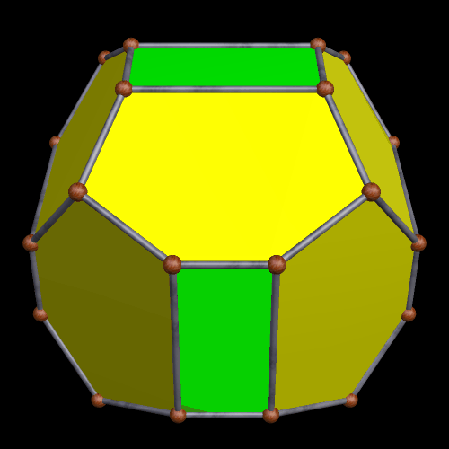 When examining uniform-density polyhedra to look for “fair dice,” therefore, one of the first things I look for is isohedrality — all faces must have the same shape, unlike the case of the cuboctahedron, but like the cases of AD&D dice. The next thing I examine is symmetry, hoping to find that a particular polyhedron’s symmetry gives no probability-advantage to any face(s). With these two tests in mind, I decided to see how many different fair, dodecahedral d12s I could find, including polyhedra which could work, whether or not such shapes had actually been used as real dice, at any time, by anyone.