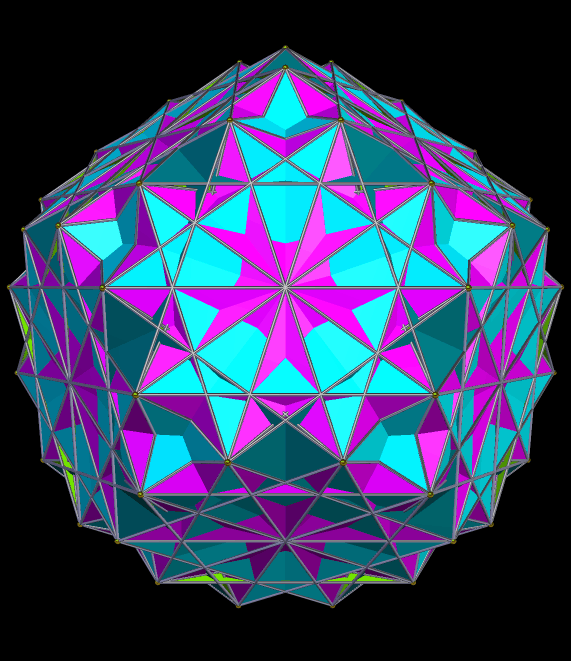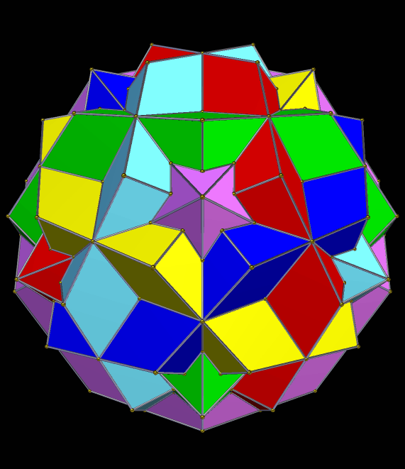 As the dual of the regular-antiprism compound, this fourth image shows the “canonical” compound of six pentagonal trapezohedra, and it has more elongated kites for faces than the first one has. What I originally found with all of my stellations, etc., shown in the first image above, was a compound of six pentagonal trapezohedra, not the compound of six pentagonal trapezohedra. As for the non-compound dual solid shown in the second image above, it is unusual because it had an unusual origin — my long series of stellations and other transformations of polyhedra. Beyond that, I haven’t yet figured it out.