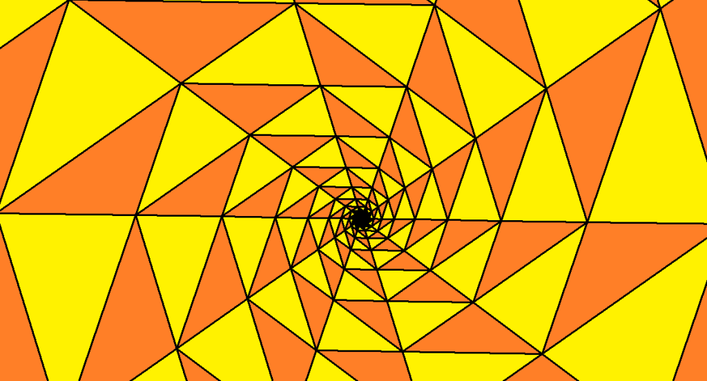 In this tessellation, golden rectangles are shown in yellow. The orange darts are each made of two golden gnomons, joined at a leg — while the blue rhombi are each made of two golden triangles, sharing a base.