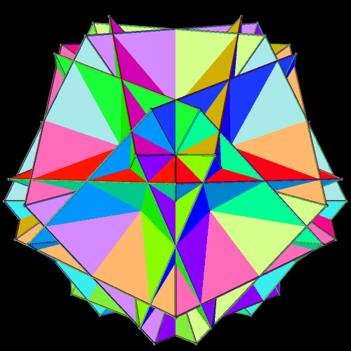 The third image, below, shows this faceted polyhedron in “rainbow colored mode.” I made these images using Stella 4d, which you can try for free at this website.