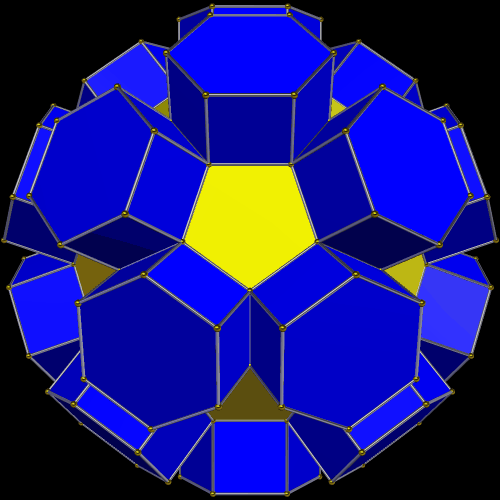 This latest convex hull has an interesting dual, which is shown below. It blends characteristics of several Archimedean solids, including the rhombicosidodecahedron, the truncated icosahedron, and the great rhombicosidodecahedron.