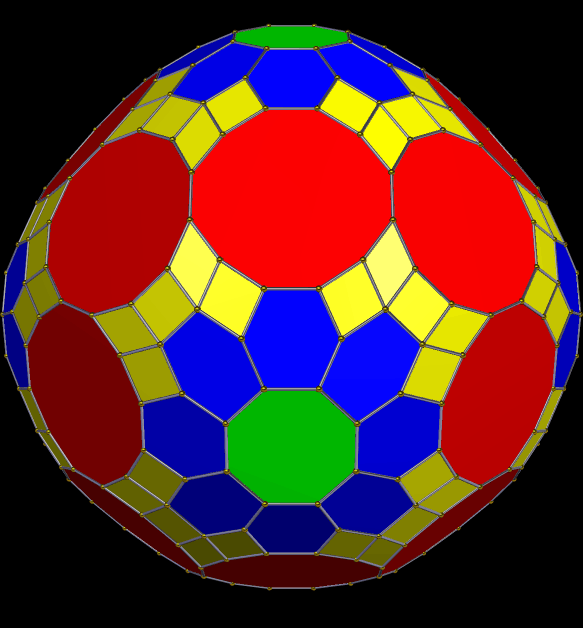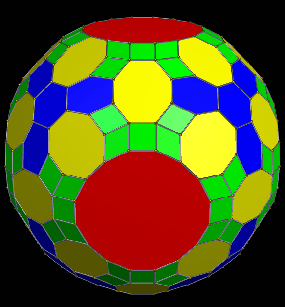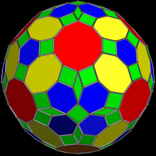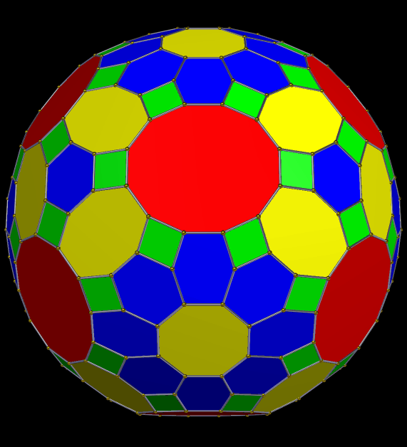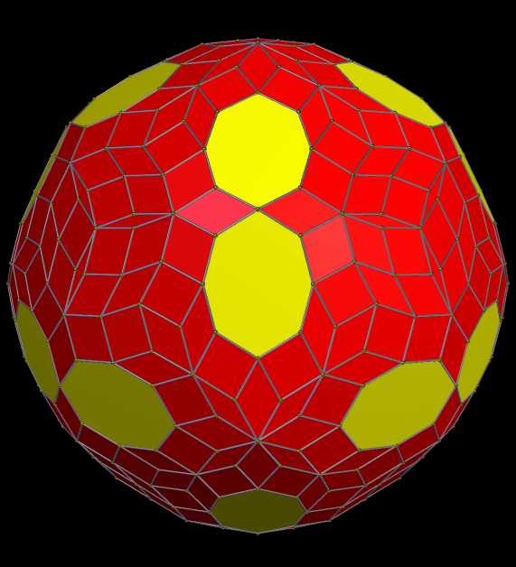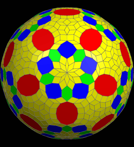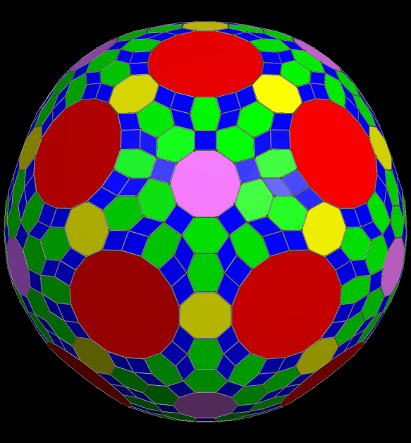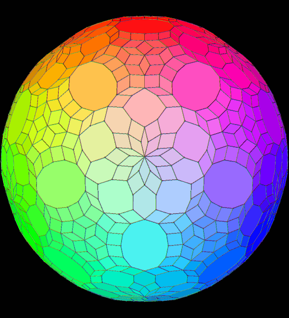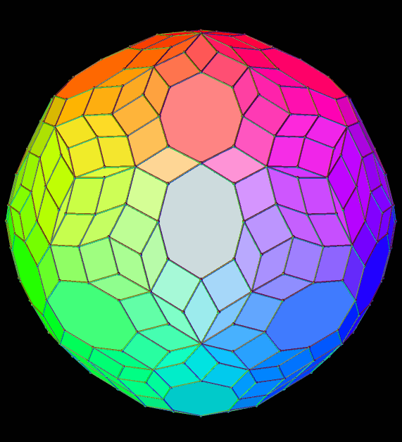 This zonohedron has 432 faces, and is shown here with two different coloring-schemes — coloring faces by number of sides (above) and rainbow color mode (below). I made these using Stella 4d, which you can try for yourself, for free, at this website: http://www.software3d.com/Stella.php.