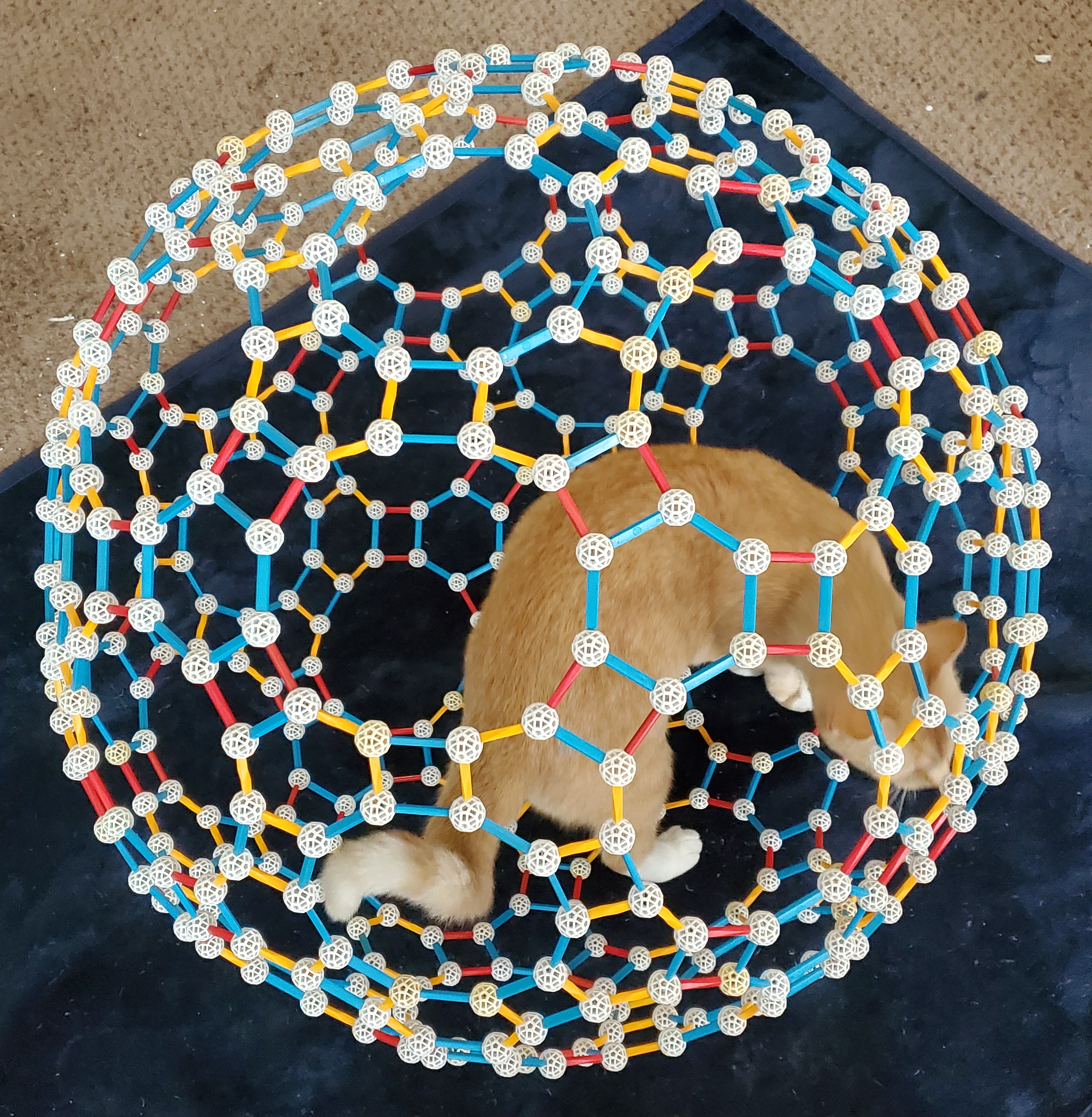 Just as I was about to take this picture of my latest Zome structure, Bandit the Cat slipped in through the all-blue decagonal hole where his tail is still located. He stayed in it until it had been thoroughly inspected, then slipped back out. He did this without causing the slightest bit of damage to the model.